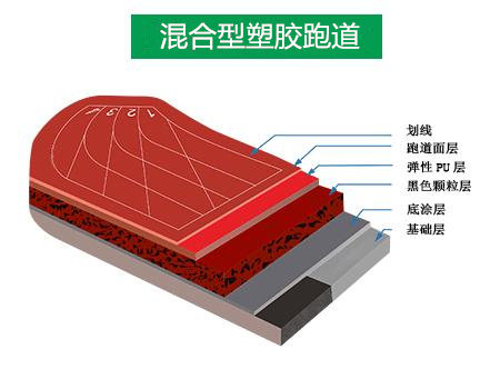 混合型聚氨酯跑道以化學原料在工廠制備甲乙兩組分, 現(xiàn)場使用時,將兩組分混合,同時加入填料等,經(jīng)過鋪設(shè)、噴涂顆料等一系列工序而成。具有彈性好、防滑、耐磨等優(yōu)點,且面層不容易脫粒。廣泛使用于國際、國內(nèi)大中型田徑場。
